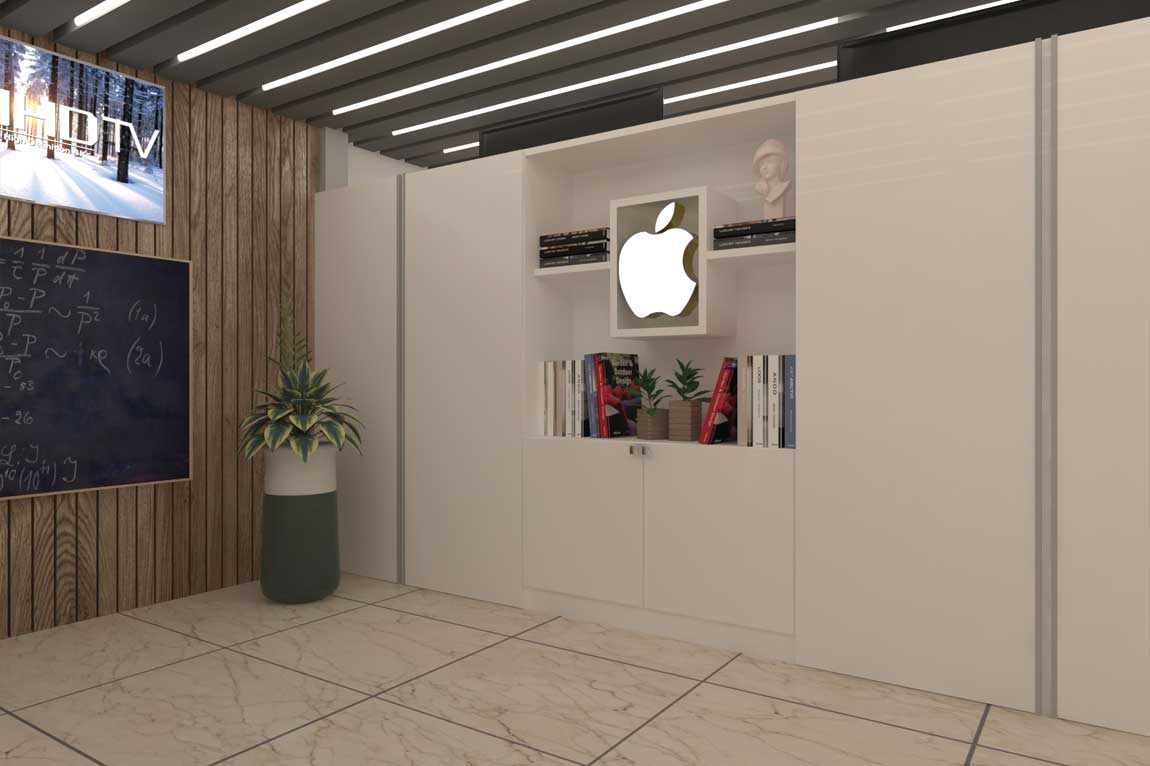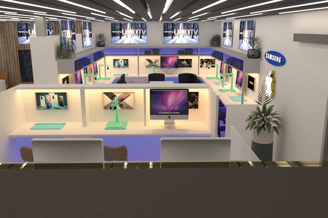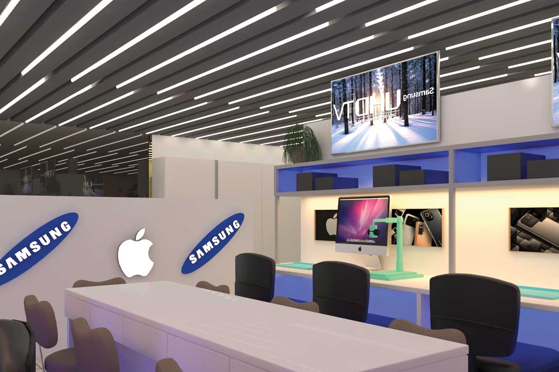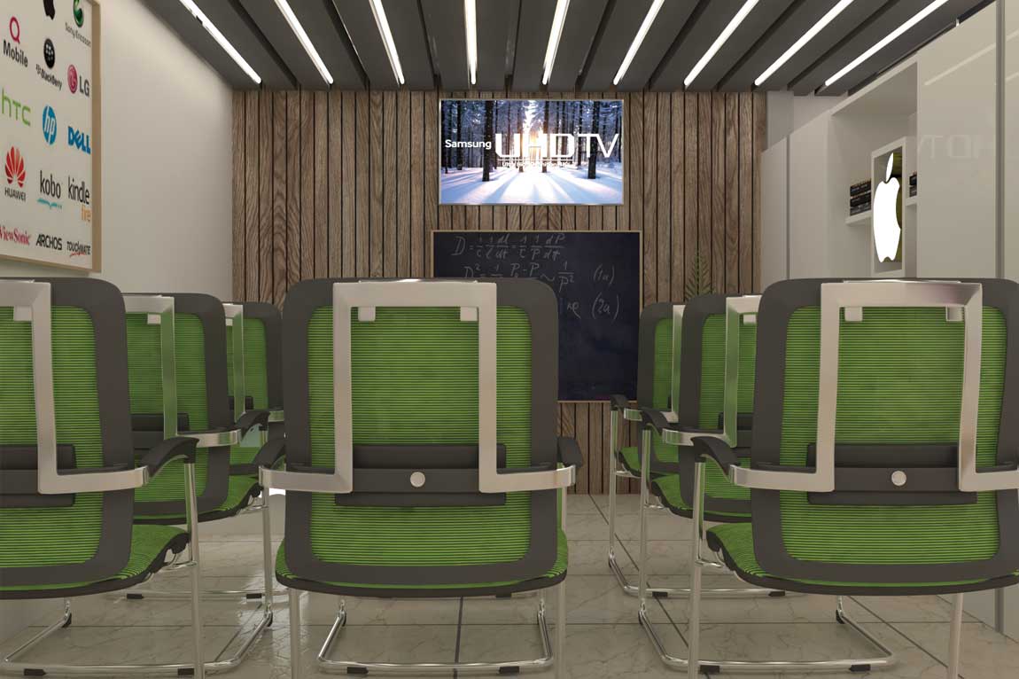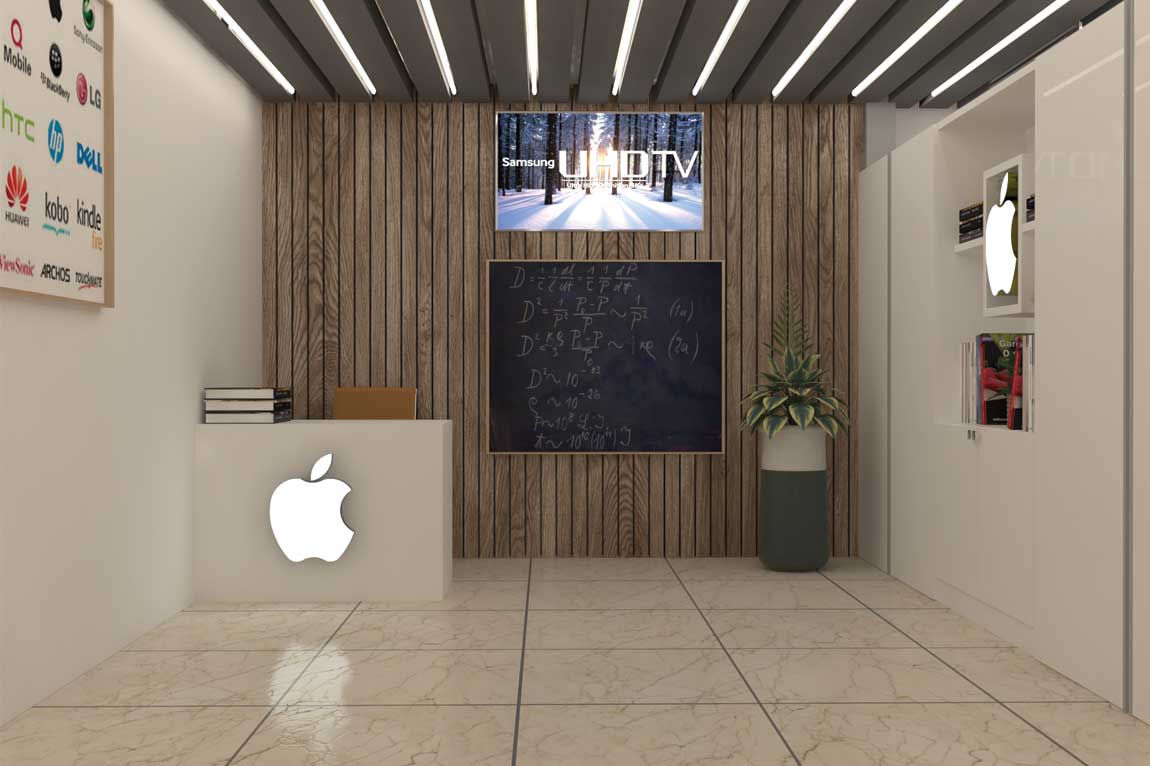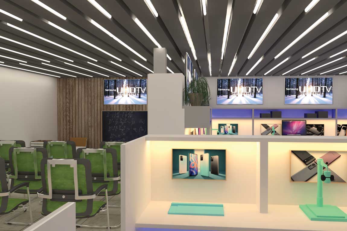 استفاده از تیوها که برا نشان دادن بزرگ درقسمتهای آموزشی نصب شده وسایرتجهیزات لازم در قسمت آموزشی عملی قرار گرفته و استفاده از نمادها وبرندهای گوشیها برای جذابیت محیط و استفاده از قفسه های بصورت کمدی برای دپوی قطعات لازمه در آن طراحی شده است تا فضا بهترین کارایی را داشته باشد.